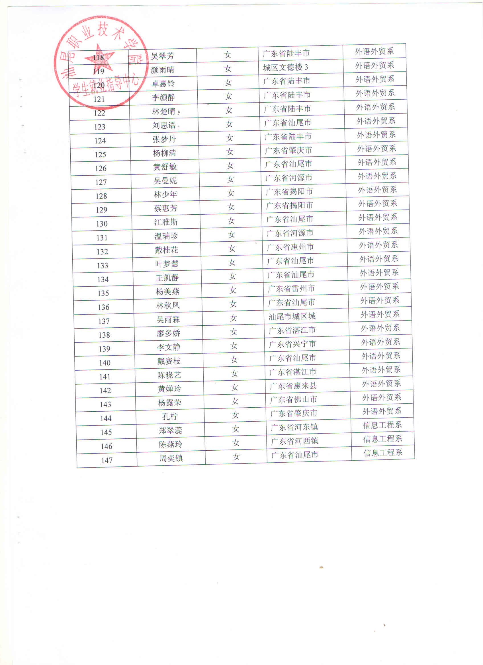 汕尾职业技术学院申请吴丽青等147名困难家庭高校毕业生求职创业补贴220500元(一次性每人标准1500元,附名单)。根据市人力资源和社会保障局、市财政局《关于明确就业创业专项资金补贴项目申请和核发有关事项的通知》(汕人社发〔2015〕165号)规定,拟同意在就业专项资金列支,拨付汕尾职业技术学院求职创业补贴220500元,由汕尾职业技术学院将补贴发放给吴丽青等147名困难家庭高校毕业生本人。现予公示。公示时间:5日(2018年11月22日至28日)