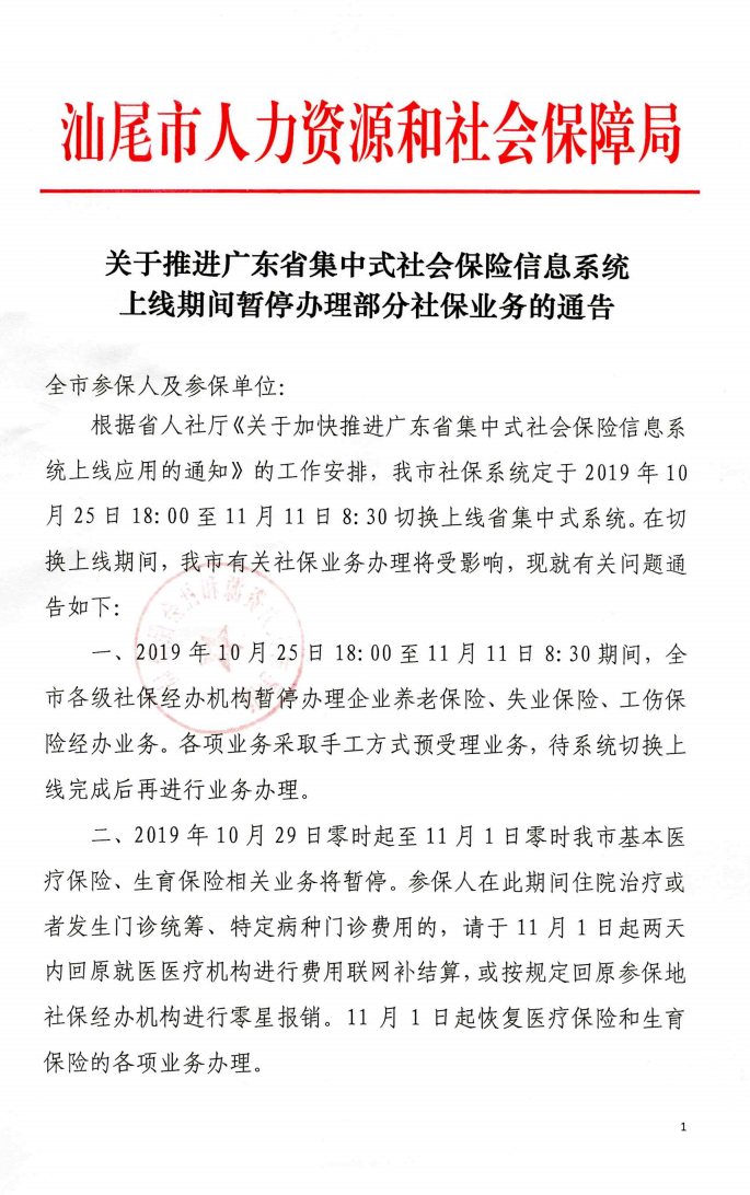 关于推进广东省集中式社会保险信息系统上线期间暂停办理部分社保业务的通告