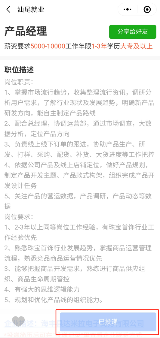 【步骤四】点击“投递简历”,选择要投递的简历,点击“确定”即可完成求职申请。