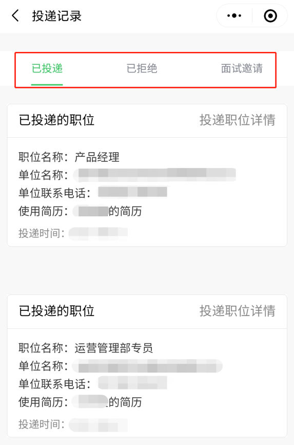 02“投递记录”可以帮助求职者查询企业联系方式,还可实时展示简历投递进展情况。