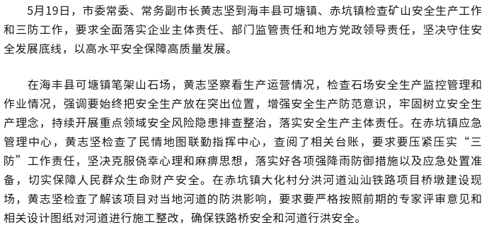 黄志坚到海丰县检查矿山安全生产和三防工作 以高水平安全保障高质量发展