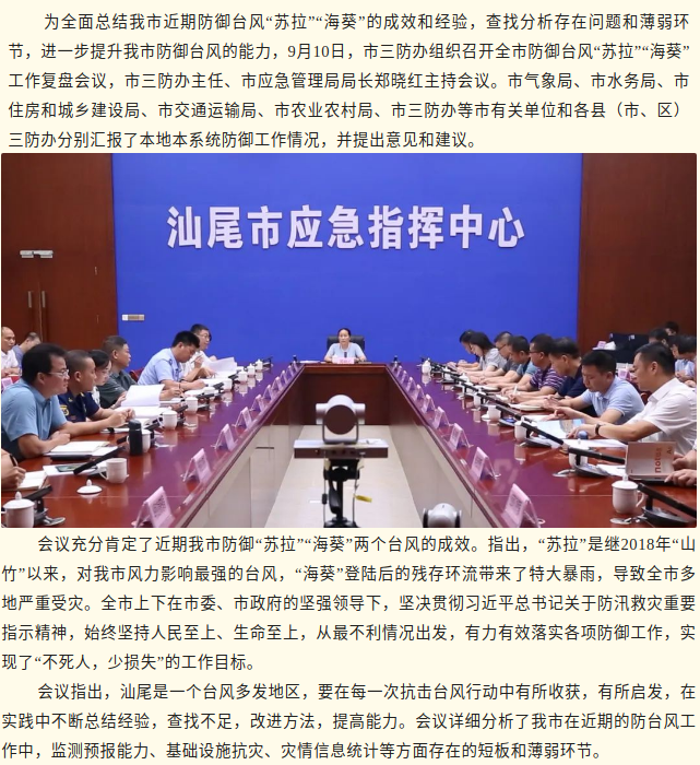 我市召开全市防御台风“苏拉”“海葵”工作复盘会议