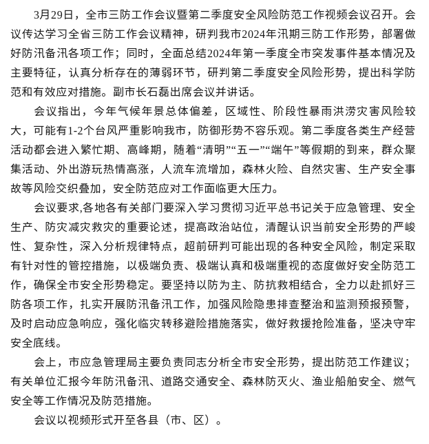 全市三防工作会议暨第二季度安全风险防范工作视频会议召开
