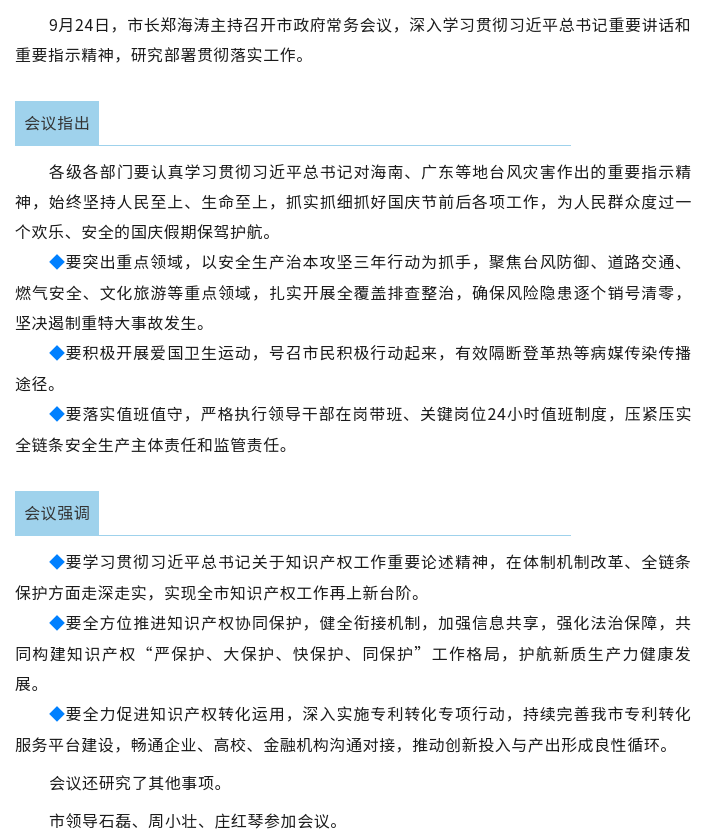 市政府常务会议召开 研究部署国庆假期安全生产等有关工作