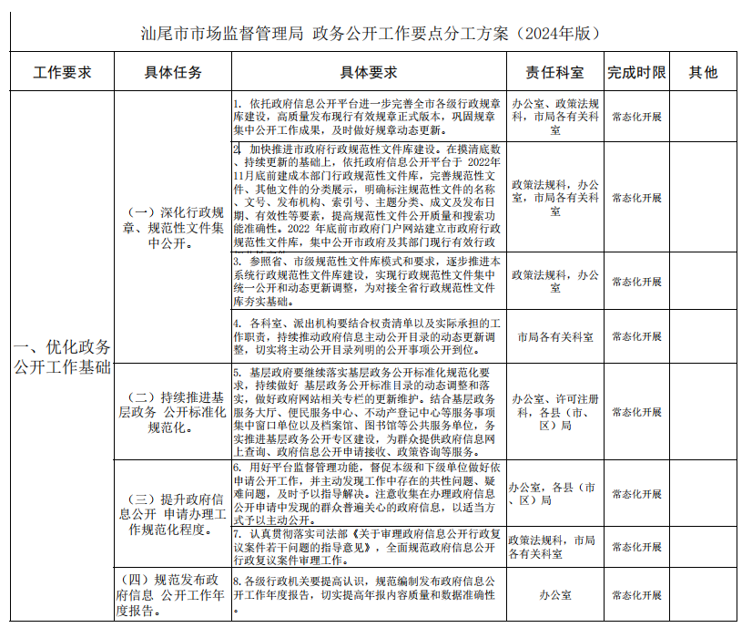 汕尾市市场监督管理局 政务公开工作要点分工方案(2024年版)