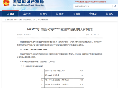 国家知识产权局发布公告,自2025年7月1日起,执行新的PCT申请国际阶段费用的人民币标准。