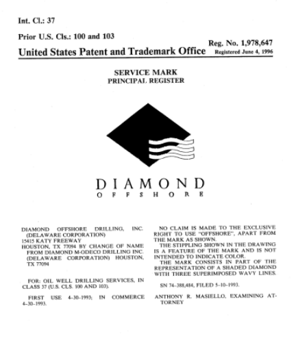 涉案商标为戴蒙德海上钻探的“DIAMOND OFFSHORE”商标(注册号:1978647,以下简称’647号商标),该商标于1996年6月4日注册生效,经核定使用在第37类包括油井钻探的相关服务上。