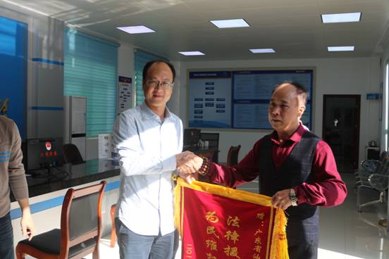 2019年11月23日下午,法律援助案件受援人黄某强来到市司法局公共法律服务大厅,送来一面写有“法律援助伸援手 为民维权解民忧”的锦旗。黄某强一边将锦旗送到法援工作人员的手中,一边对法援中心为他提供的帮助表示由衷地感谢。