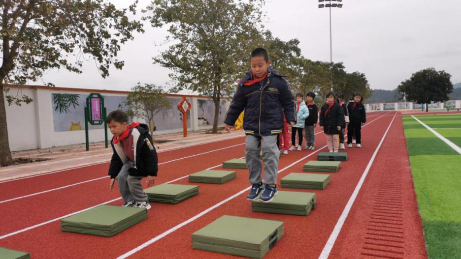 踢足球、跳绳、接力跑、武术操……龙颈镇中心小学的同学们正在老师的带领下,在新改造的运动场上进行体育活动,加油呐喊声、欢呼声不绝于耳。