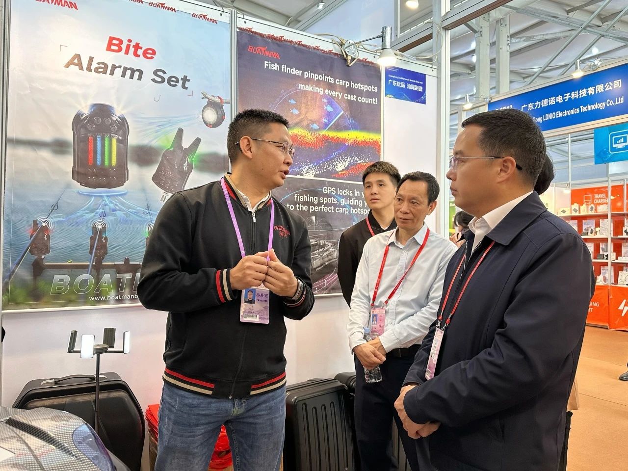 首次参展的广东省船夫电子有限公司展示的利用海洋系统解决远投问题的产品以及具备声纳探鱼器的淡水钓黑科技打窝船吸引众多客商。周小壮询问企业在技术研发、市场拓展等方面的情况,叮嘱相关部门在产品研发、测试以及拓展文旅休闲经营方面加大对企业的支持力度。