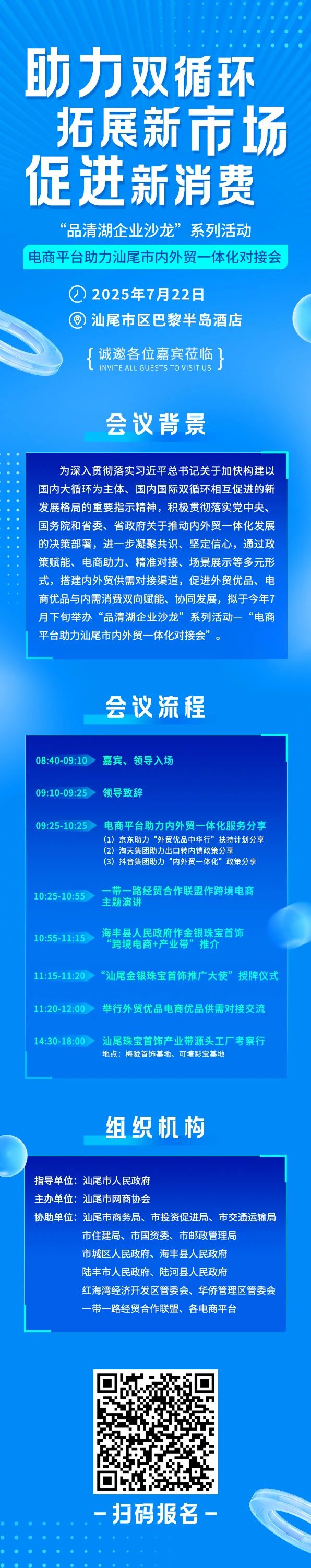 为深入贯彻落实习近平总书记关于加快构建以国内大循环为主体、国内国际双循环相互促进的新发展格局的重要指示精神,积极贯彻落实党中央、国务院和省委、省政府关于推动内外贸一体化发展的决策部署,进一步凝聚共识、坚定信心,通过政策赋能、电商助力、精准对接、场景展示等多元形式,搭建内外贸供需对接渠道,促进外贸优品、电商优品与内需消费双向赋能、协同发展,拟于今年7月22日举办“品清湖企业沙龙”系列活动—“电商平台助力汕尾市内外贸一体化对接会”。