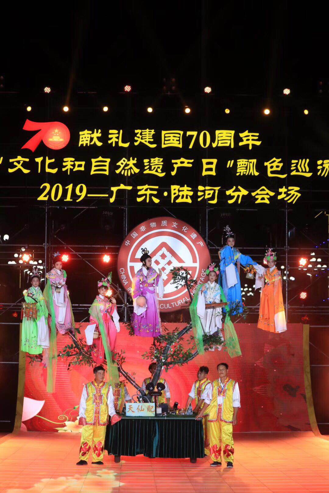 当晚7时30分,陆河县城万人空巷,在醒狮《盛世龙腾》的礼赞中,2019年“文化和自然遗产日”广东·陆河分会场国家级、省级飘色类民俗巡游活动拉开了序幕,十支非遗飘色巡游队伍从陆河县城岳溪广场途经建设西路、人民中路,迎着初夏和风,伴着五彩霓虹,在现场观众的欢呼中依次进入主会场进行集中展演。现场灯光璀璨、乐曲升平、人头攒动,童声客家山歌号子、客家童谣、女声独唱《客家擂茶》跌宕起伏,观众的喝彩把活动一次次推向高潮。随着快闪MV《我和我的祖国》的播放,巡游队伍沿着朝阳路、陆河大道、滨河路、螺河东路回到岳溪广场。沿途灯光璀璨、车水马龙,来自全省各地及当地的观众十万多人,一同见证了此次全省飘色巡游展演。