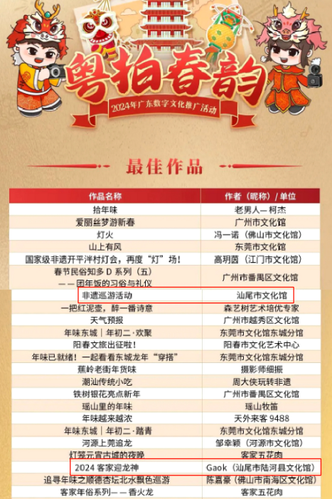 其中,我市共有两件短视频精品上榜,凭借其出彩的主题、创意、拍摄技巧及情感表达等,从全省近500条优秀短视频作品中脱颖而出!他们分别是汕尾市文化馆的《非遗巡游活动》和汕尾市陆河县文化馆的《2024客家迎龙神》。
