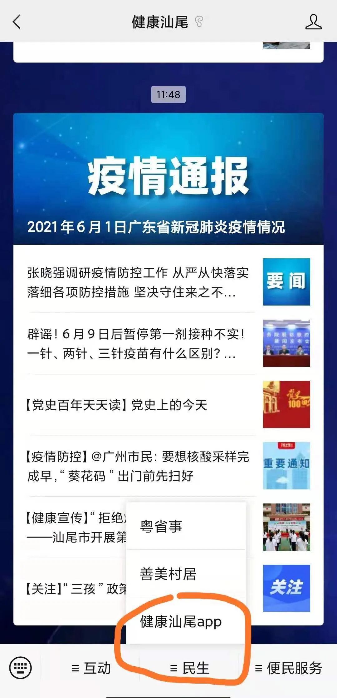 打开菜单【民生】-->【健康汕尾APP】