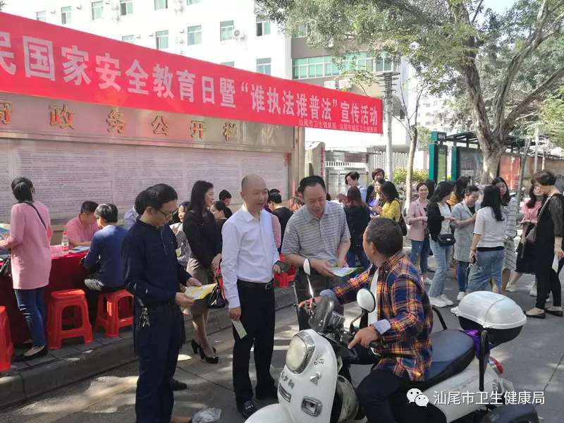 为深入学习宣传习近平总书记全面依法治国新理念新思想新战略,贯彻省委、市委关于法治宣传教育的决策部署,落实“谁执法谁普法”的普法职责,4月17日上午,市卫生健康局与城区卫生健康局在市区富临大酒店对面联合开展全民国家安全教育日暨“谁执法谁普法”宣传活动。汕尾市卫生健康局副局长许晓文、副调研员方炳奎,市城区副区长胡春莲出席活动。