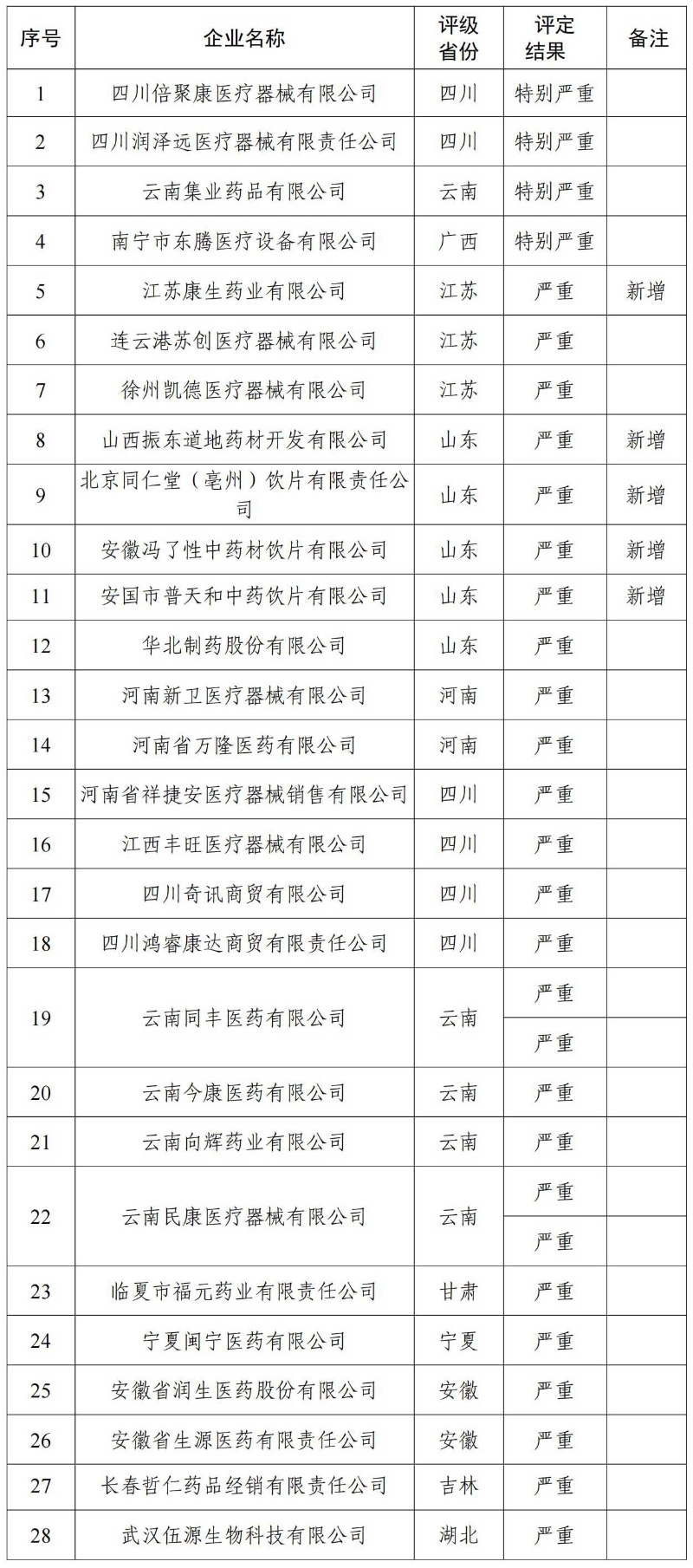 受国家医疗保障局委托,国家医疗保障局医药价格和招标采购指导中心汇总了截至2024年6月30日各省份评级为“特别严重”和“严重”失信的医药企业情况,现公告如下。