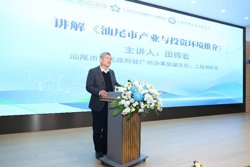 市驻广办副主任、二级调研员田得宏受邀在大会作《汕尾市产业与投资环境推介》发言。他围绕汕尾“西承东联桥头堡、东海岸重要支点”发展定位,简要介绍了汕尾的核心优势:区位交通便捷,深汕、广汕高铁贯通,融入大湾区“一小时生活圈”;资源禀赋独特,2.39万平方公里海域面积、467.5公里海岸线及优质生态环境,为康养产业提供天然土壤;政策红利叠加,革命老区振兴、产业有序转移、深汕协作等多重政策支持,为企业落地提供全周期保障。田得宏表示,汕尾正积极布局大健康与康养融合产业,诚邀各位企业家、专家学者走进汕尾考察投资,感受滨海风光与人文魅力,携手共建康养产业新高地,共享发展成果。